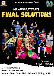 From July 15 to 22, I had the opportunity to participate in a 'Drama Workshop' organized by the Department of English at MKBU. The workshop was led by Alpa Ponda, a research scholar pursuing her Ph.D. in "Drama Pedagogy." It was based on Mahesh Dattani’s "Final Solutions" (1993) and was my first real experience with drama techniques and live performance.